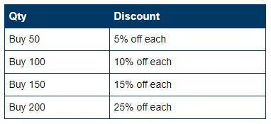 Choose your quantity and click "add to cart" to place your order. Orders have a 25 piece minimum. Take advantage of our quantity discounts.